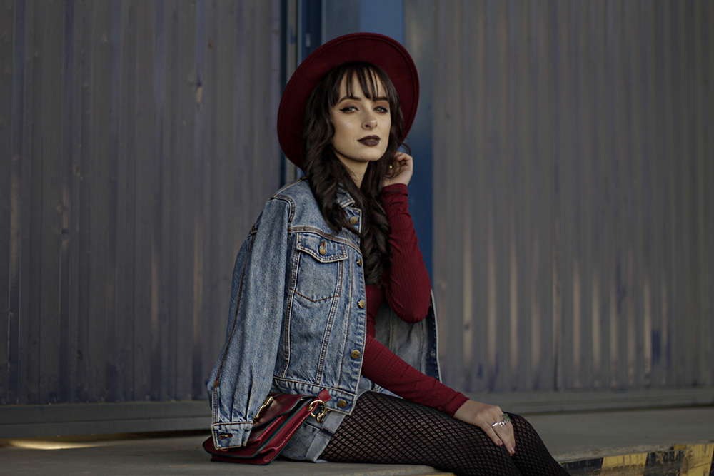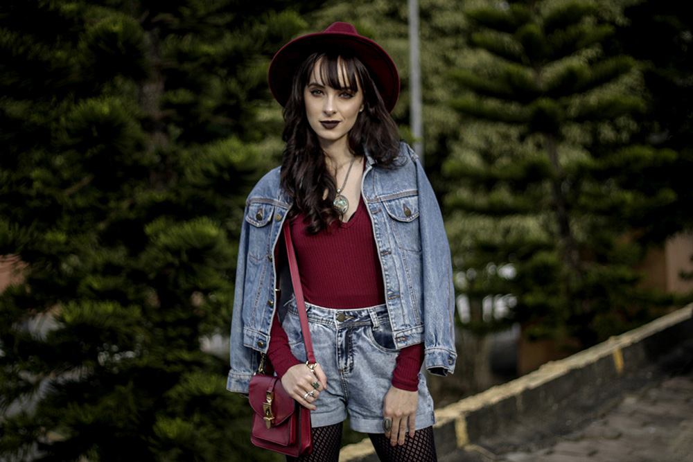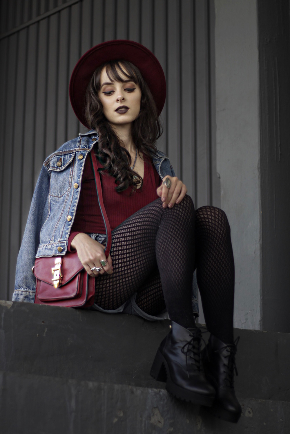 Olá! Tem look com meia-calça arrastão no blog: Uma produção casual, prática e estilosa, combinando jeans e o tom borgonha.