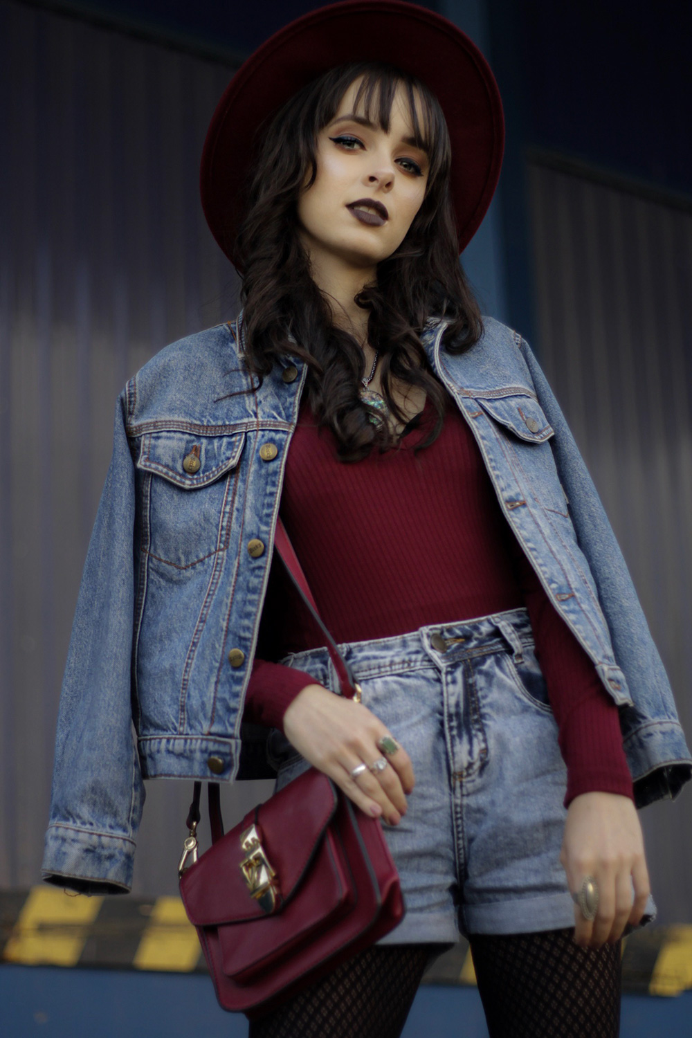 Neste Look: Jaqueta jeans Vintage, shorts Gdoky Jeans, meia-calça Trifil, bota Cravo & Canela, bolsa Macadâmia.