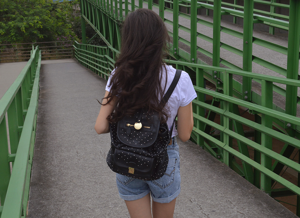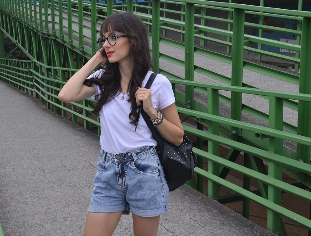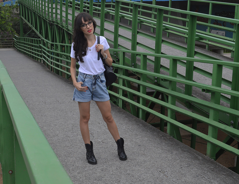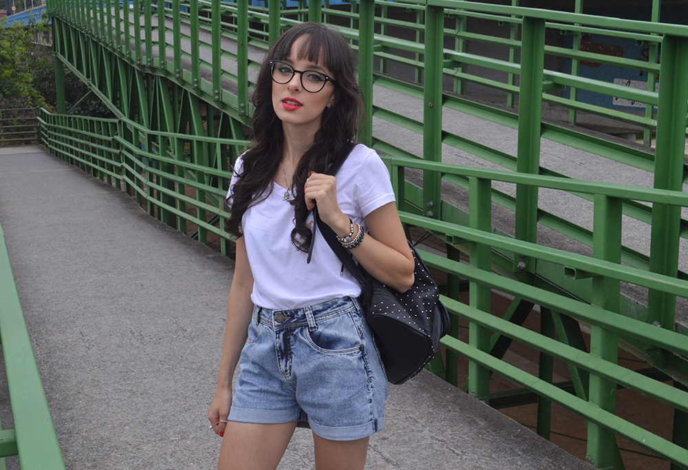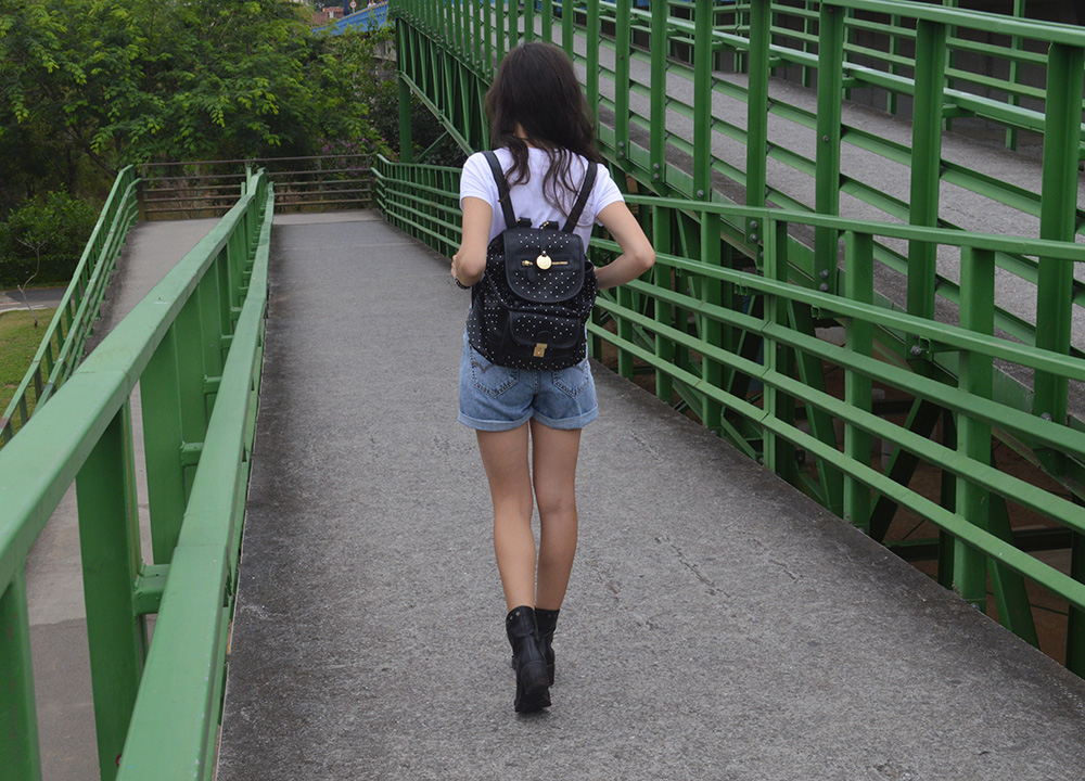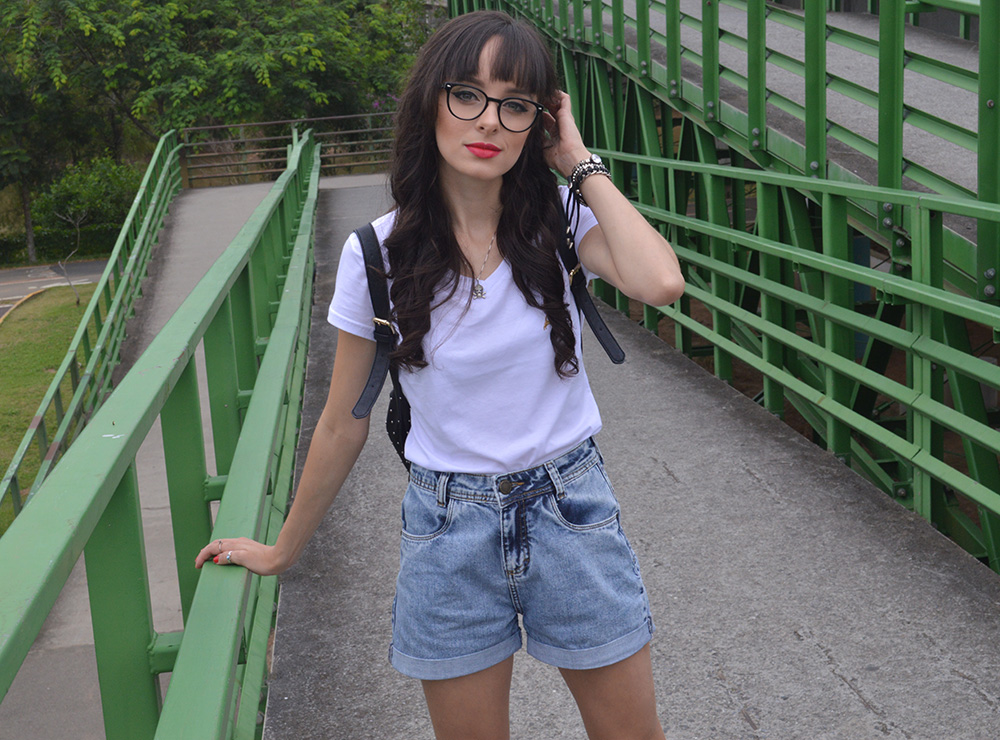 Shorts Gdoky Jeans, T-shirt Beagle, Coturno Tanara, Mochila Macadâmia, Óculos Ray-ban.