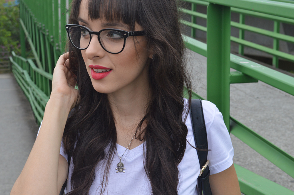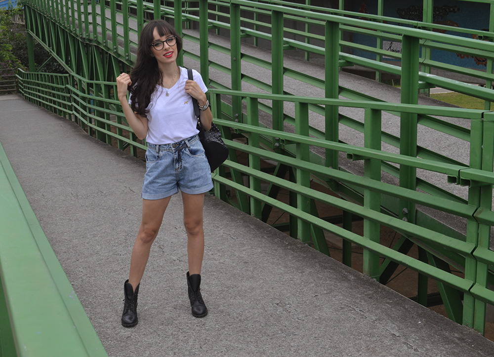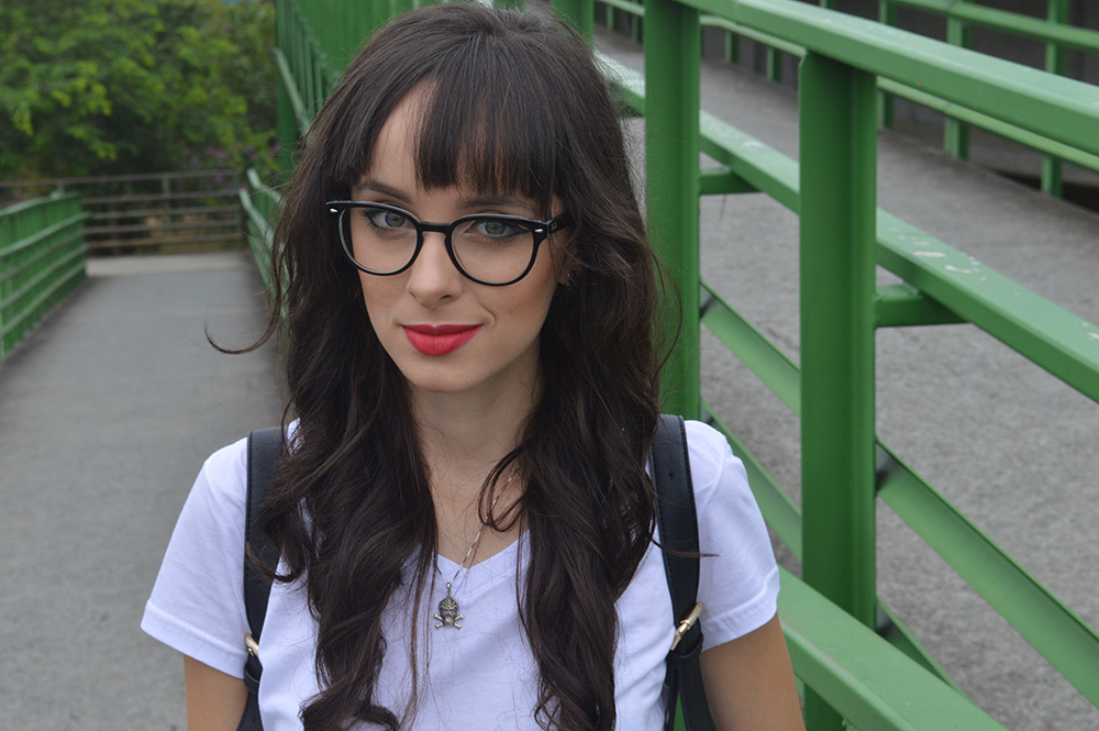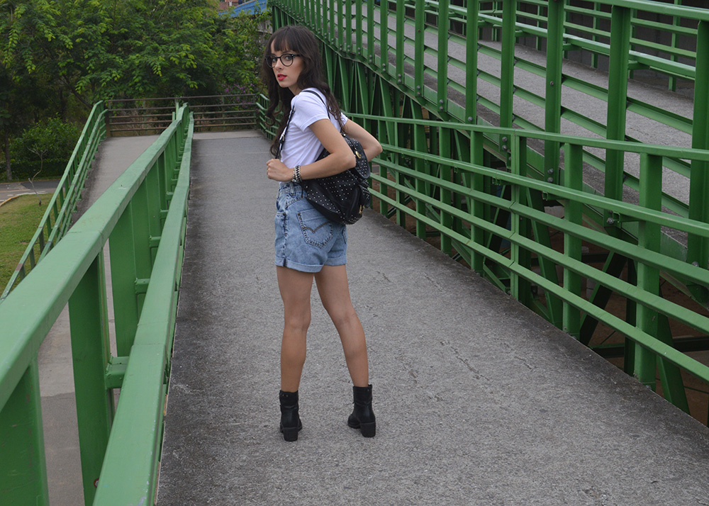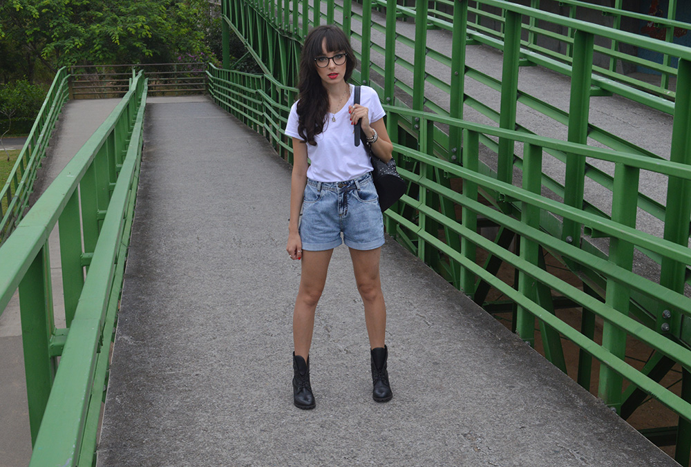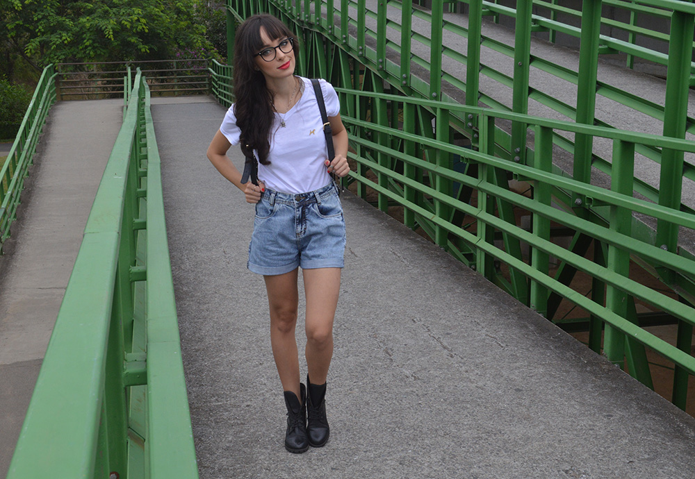 Para deixar a produção do jeito que eu gosto, apostei em acessórios com pegada rocker, como a mochila, as pulseiras e o coturno. Também utilizei meus óculos de grau, adoro este ar “geek” que ele proporciona.