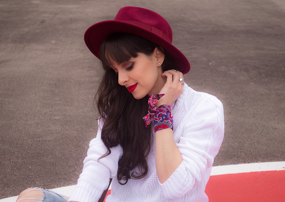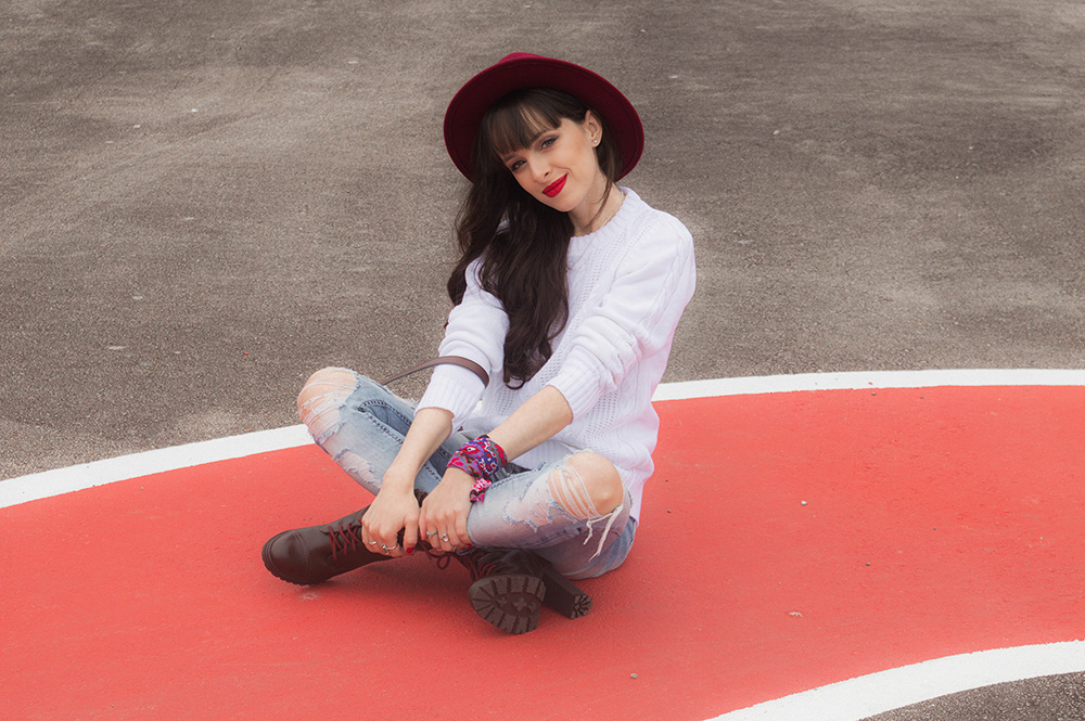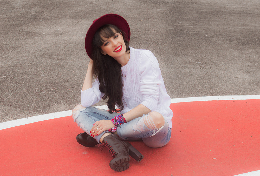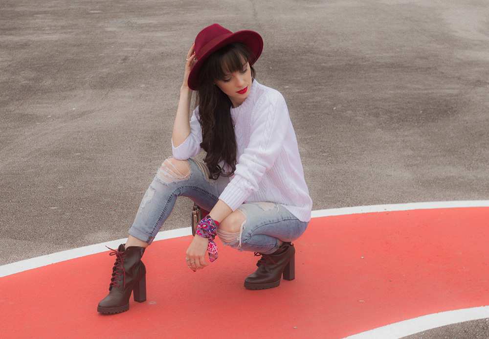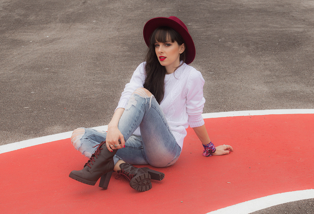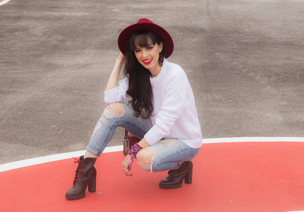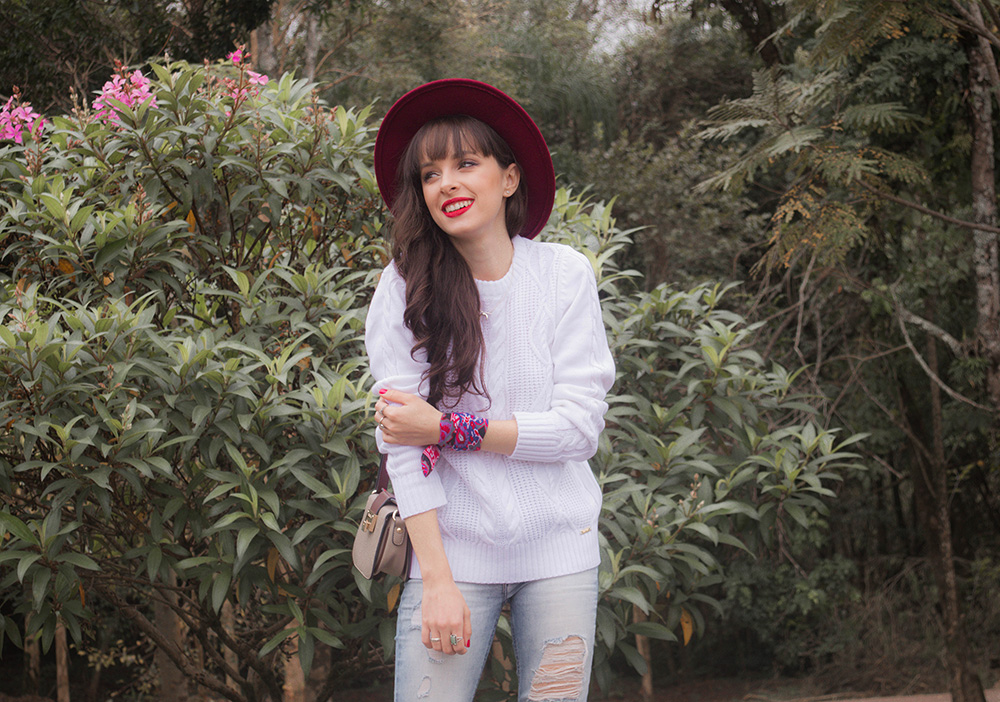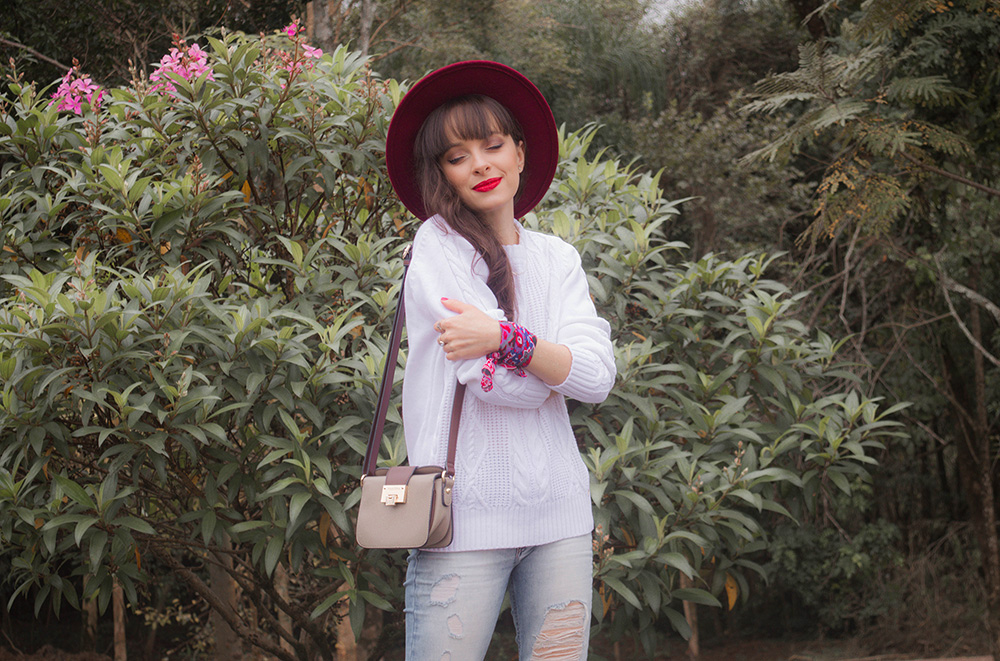 O tricot é uma peça básica mas que pode ser usada para compor looks bem estilosos. Nesta produção apostei na combinação de calça jeans skinny rasgada e também em acessórios com toque de cor para que o visual não ficasse tão neutro. Apostar em acessórios com cores fortes é uma ótima opção quando o restante do look está em cores neutras. Nos pés usei um coturno com salto que também possui um toque de cor nos detalhes.