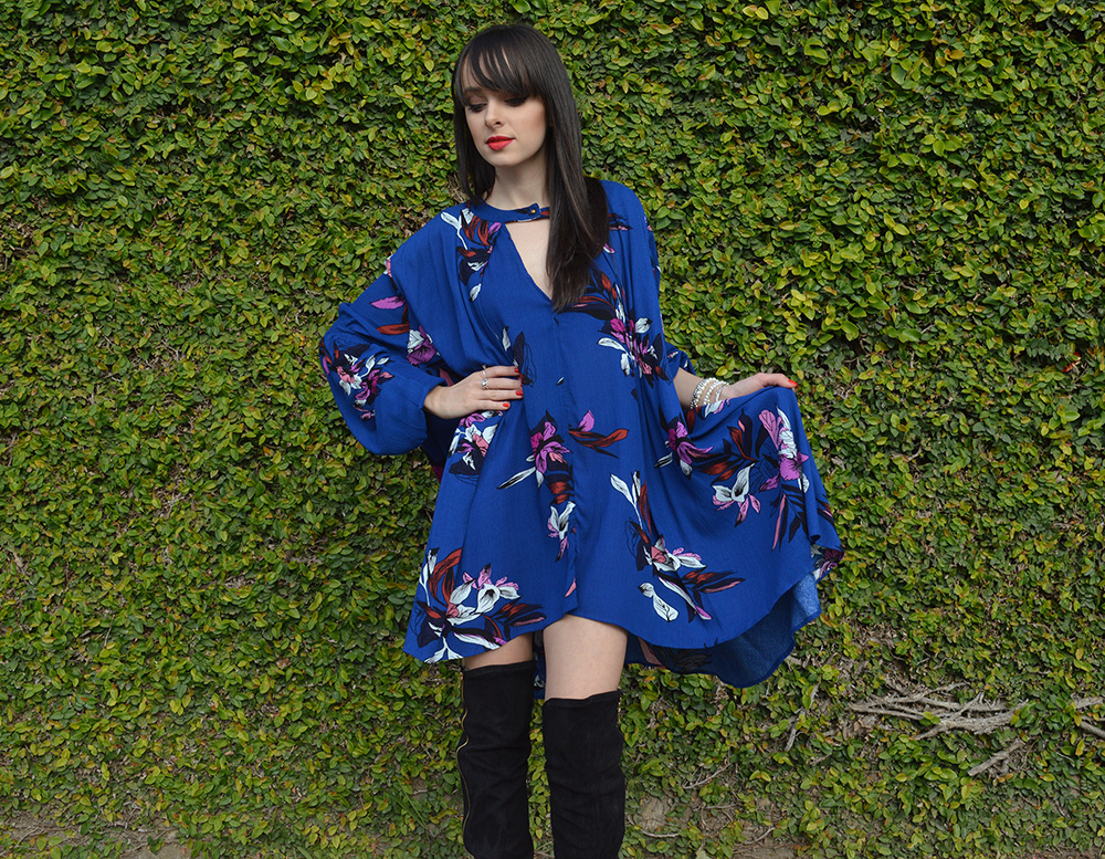 a modelagem e a cor do vestido, ou seja, o azul levemente escuro e a peça mais solta foi a escolha ideal para harmonizar com a bota