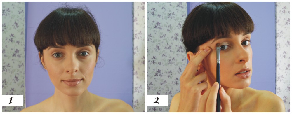 1 – O primeiro passo é preparar a pele. Há algumas pessoas que preferem maquiar primeiro os olhos para que fragmentos das sombras não manchem o rosto, mas isso é uma questão de gosto mesmo. Eu preparei a minha com primer, base, corretivo e também fiz um contorno de leve com pó bronzeador.