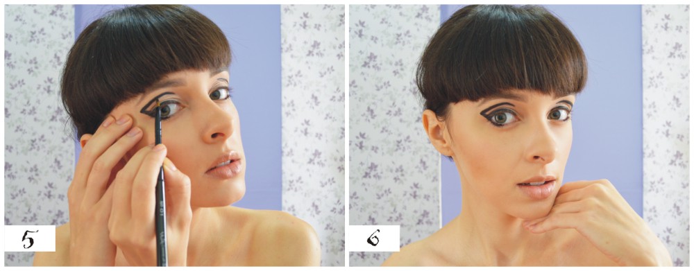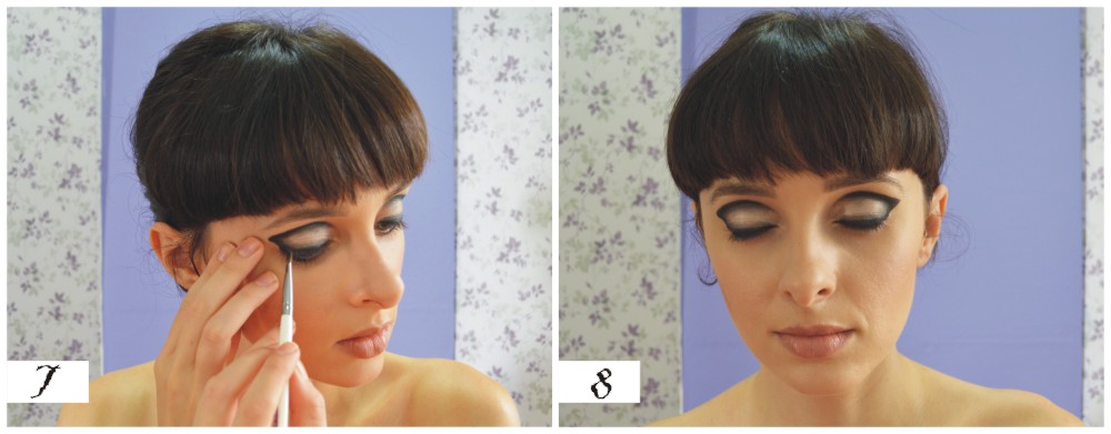 7 e 8 – Aplique uma sombra preta com um pincel de precisão esfumando de leve o traço marcado e os cílios inferiores. Cuide para não sair para fora do desenho do lápis;