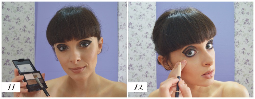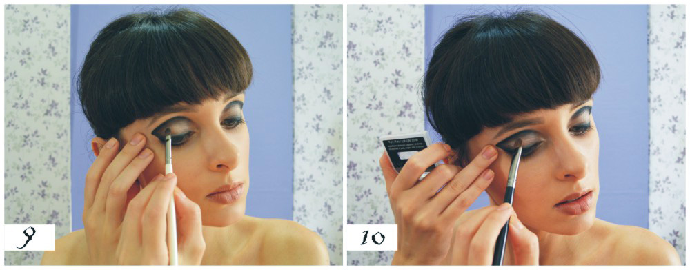 9 – Com uma sombra marrom escura e com o pincel de precisão esfume o canto externo dos olhos levando um pouco de sombra também até o côncavo e rente aos cílios superiores;
