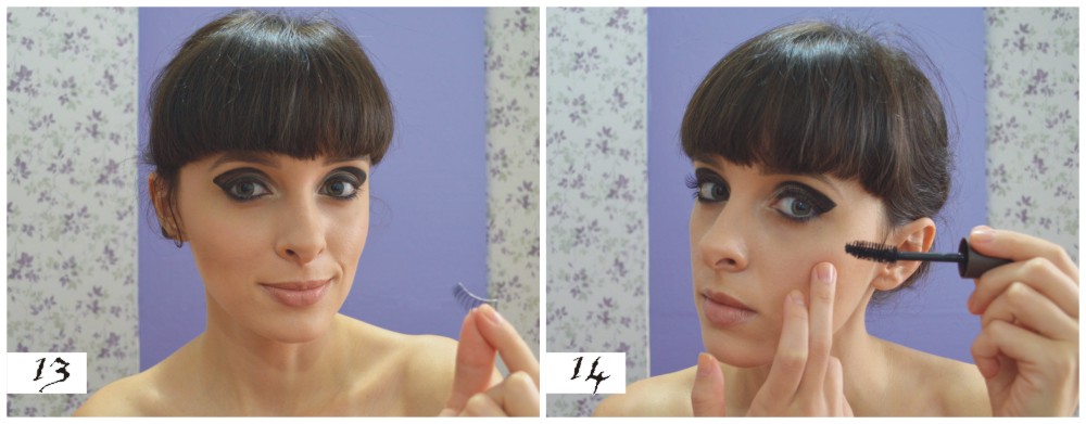 13 e 14 – Cole os cílios postiços rente ao cílios superiores e aplique a máscara para cílios caprichando nos cílios inferiores;
