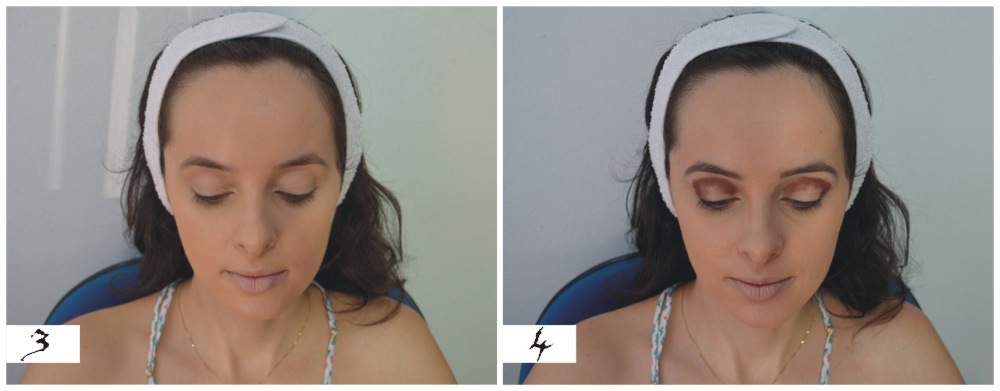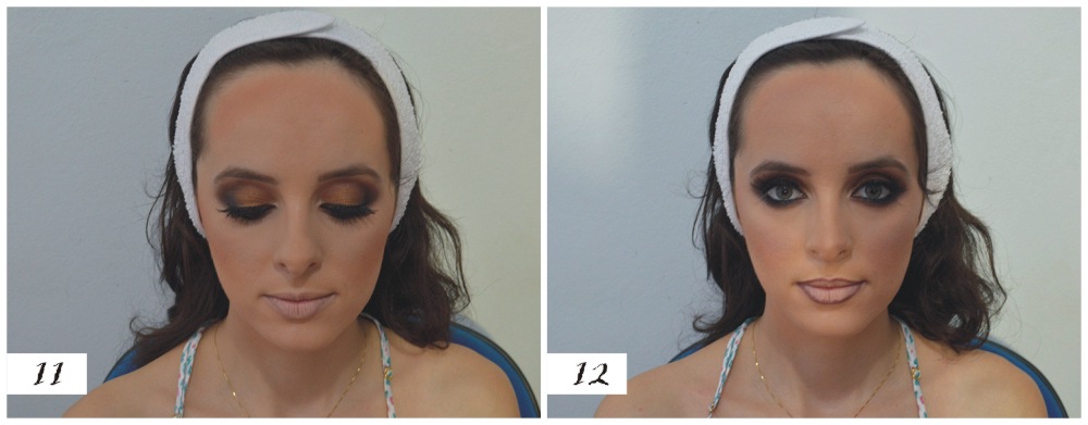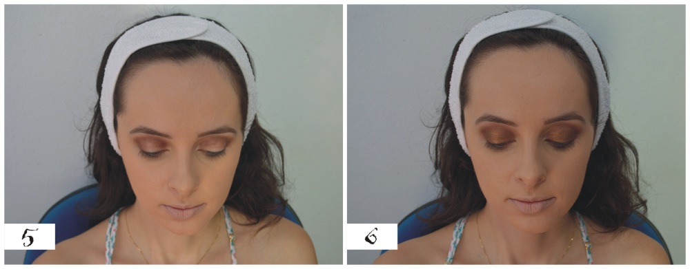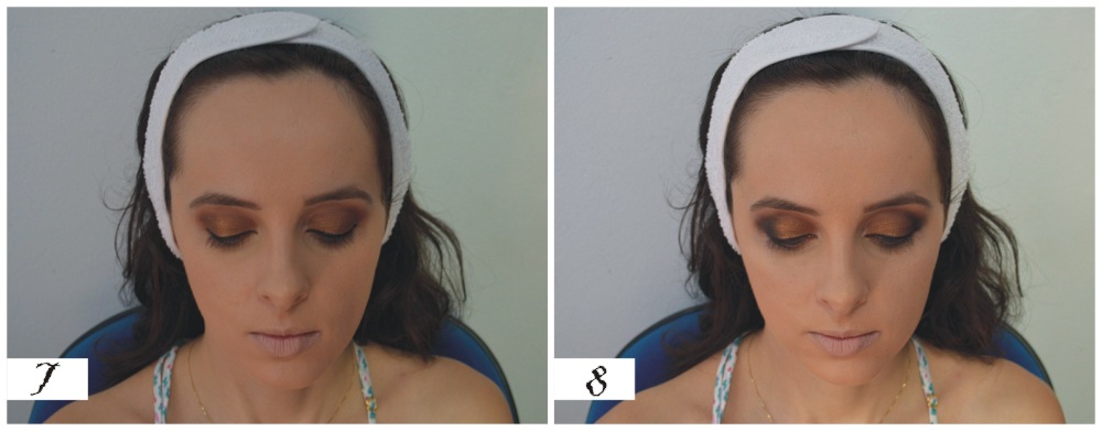 6 – Foi aplicada na pálpebra a sombra de tom acobreado da paleta Sephora com pincel de sombra Macrilan e também sombra clara abaixo da sobrancelha da mesma paleta;